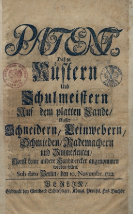 - Patent, Daß zu Küstern und Schulmeistern Auf dem platten Lande, Ausser Schneidern, Leinwebern, Schmieden, Rademachern und Zimmerleuten, Sonst keine andere Handwercker angenommen werden sollen : Sub dato Berlin, den 10. Novembr. 1722